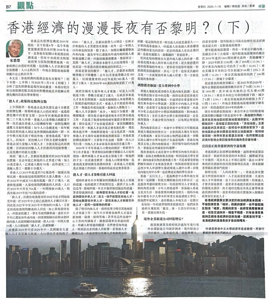 The economic recession crisis in Hong Kong since 2019 is discussed. Talent and population policy are argued to be crucial role for Hong Kong’s future.