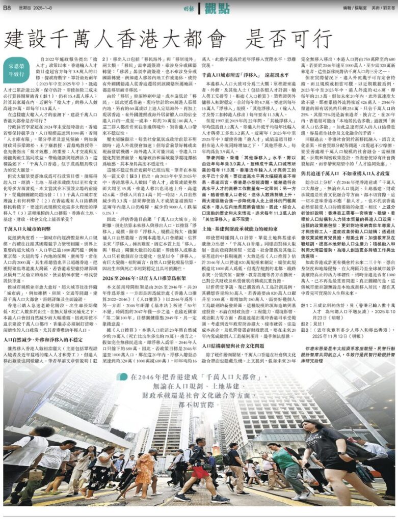 - 積極推進人口政策 建設千萬人香港大都會 by Yun-wing Sung and Wilson Wong